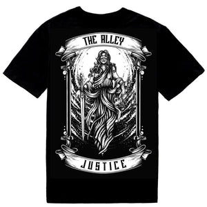 Gothic Lady Justice Tshirt: Gothic art style depiction of Lady Justice. HUGE print - 30% larger than our classic prints. Printed in white on solid black cotton men's cut tshirt.